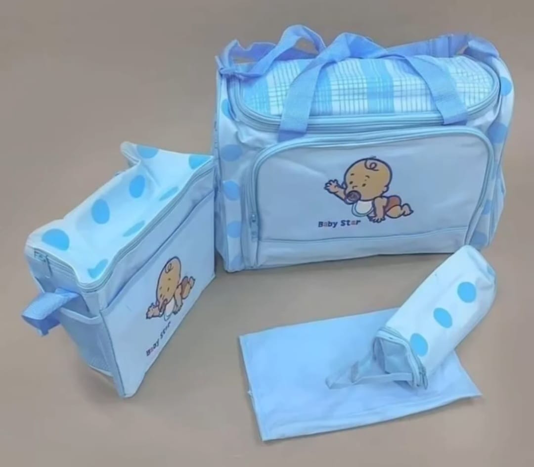 Complete 4-in-1 baby diaper bag set with large bag, small bag, changing mat, and feeder bottle cover. Perfect for organized baby care and travel.